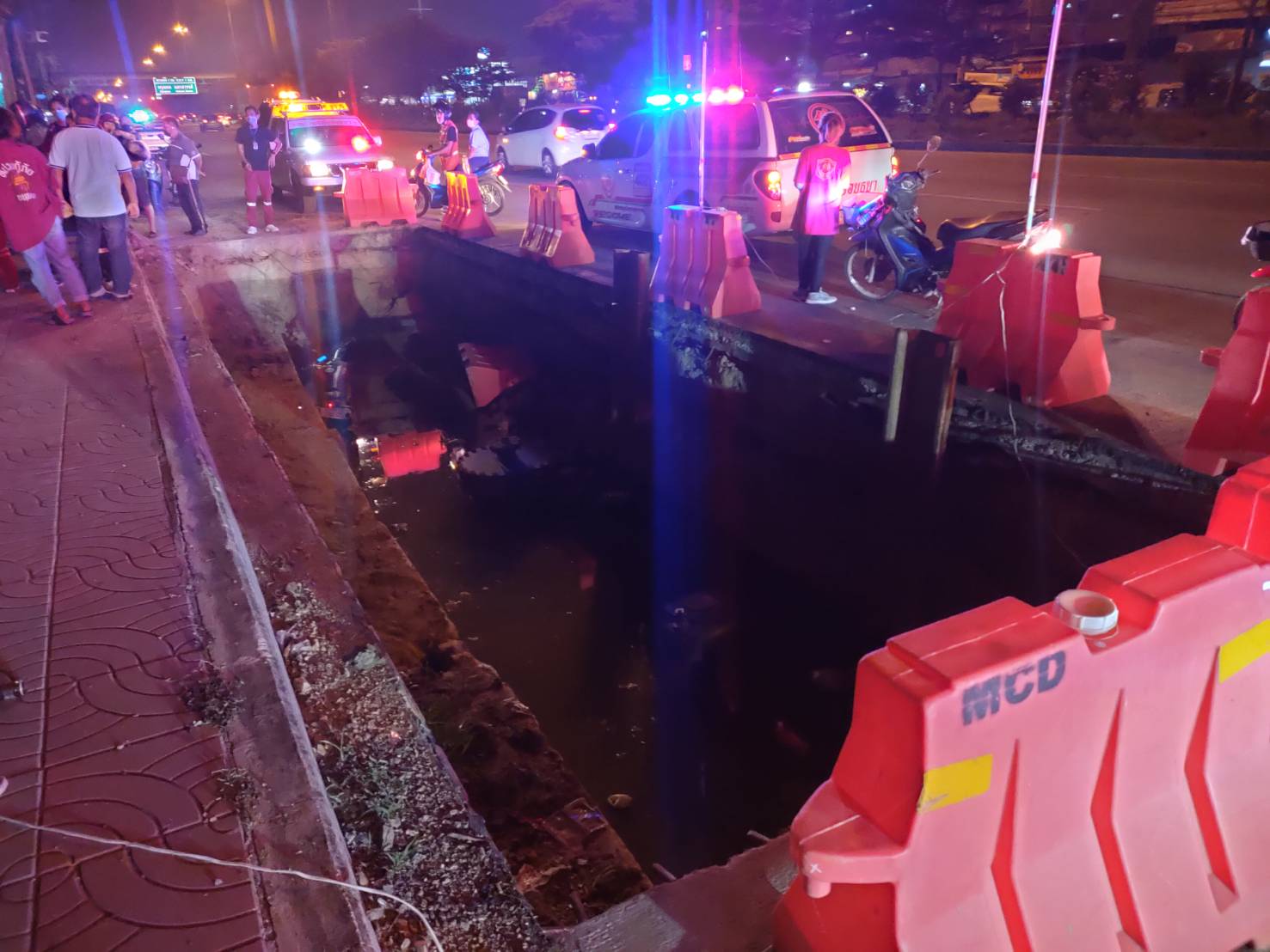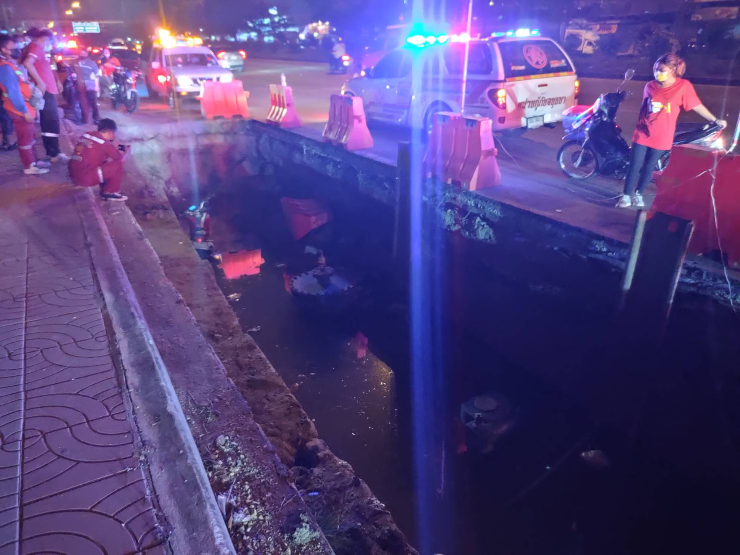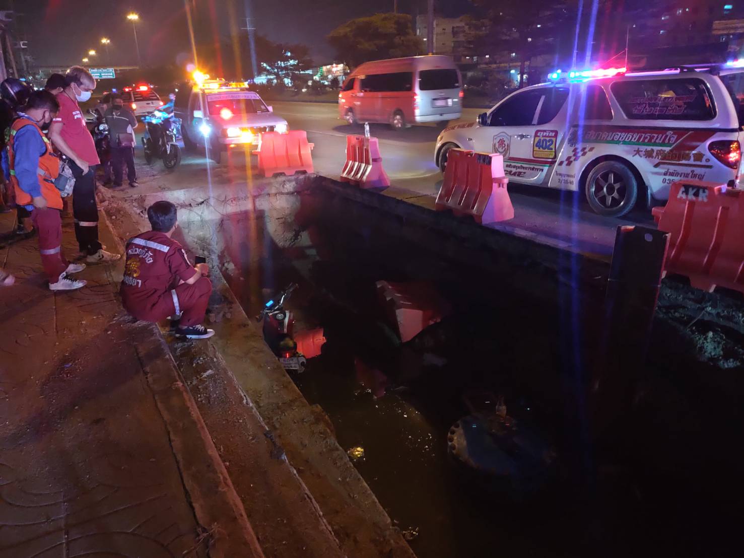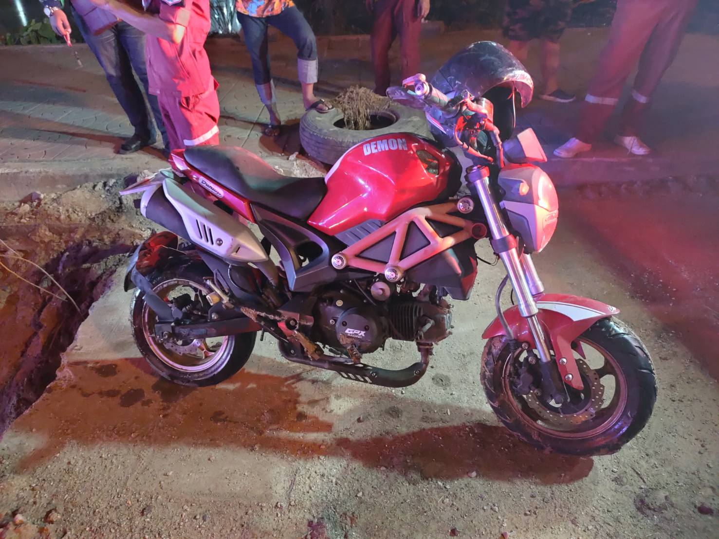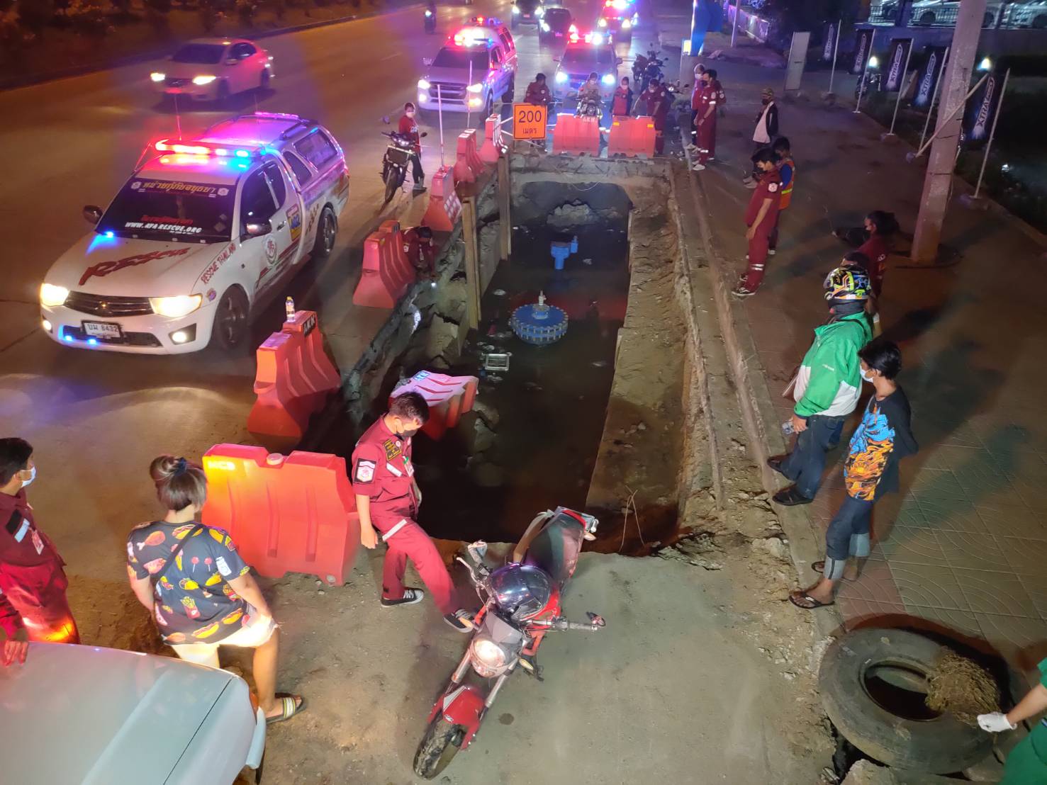 หนุ่มโรงงานขี่รถจักรยานยนต์ชนแท่งแบริเออร์พลัดตกหลุมกลางถนนโรจนะ กำลังวางแนวท่อประปา