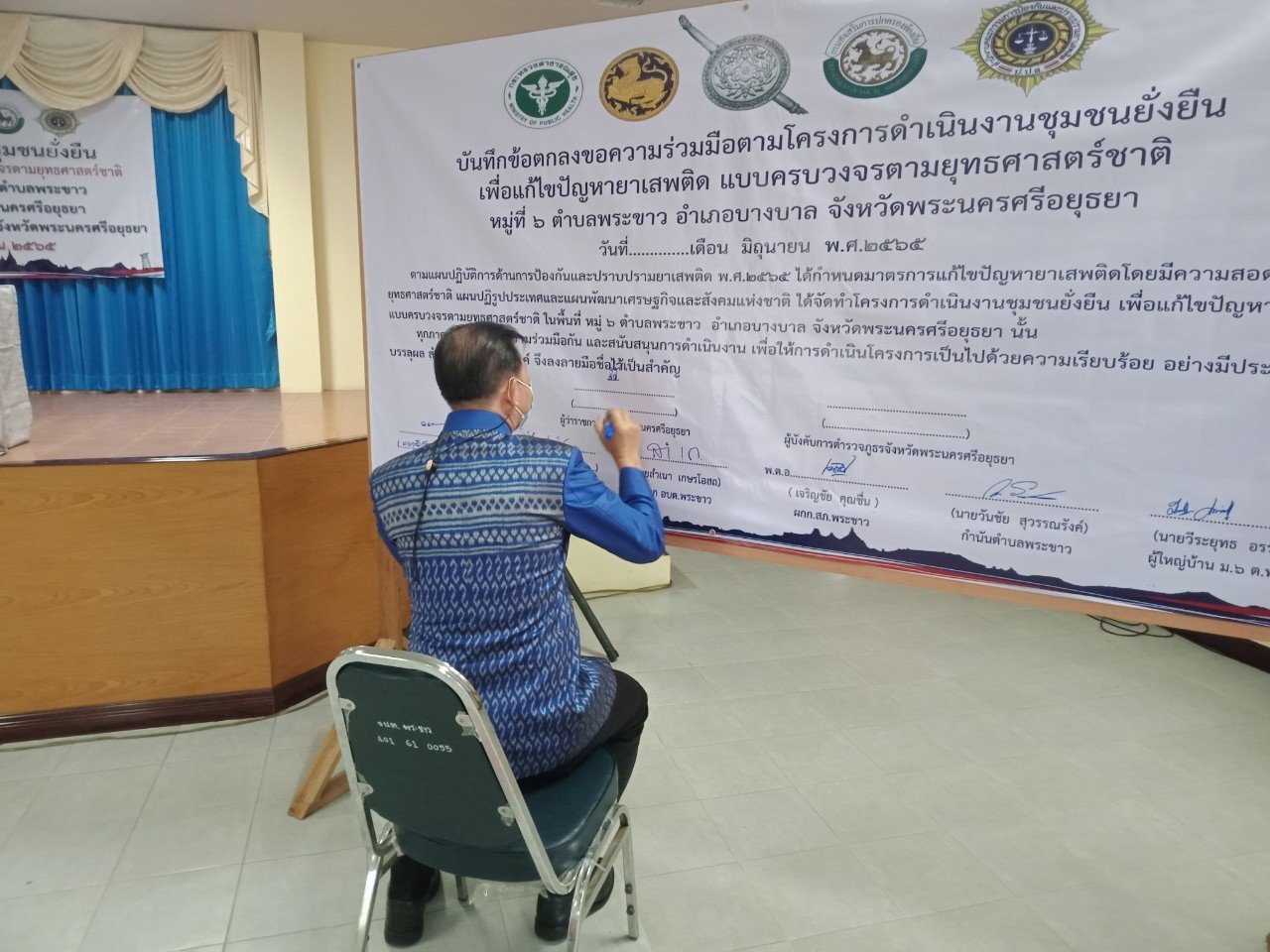 พ.ต.อ.เจริญชัย คุณชื่น ผกก.สภ.พระขาว กล่าวว่า โครงการดำเนินงานชุมชนยั่งยืน เพื่อแก้ไขปัญหายาเสพติดแบบครบวงจร ตามยุทธศาสตร์ชาติ สถานีตำรวจภูธรพระขาว ได้รับมอบหมายจาก ตำรวจภูธรจังหวัดพระนครศรีอยุธยา และตำรวจภูธรภาค 1 ให้ดำเนินการเพื่อแก้ไขปัญหาการแพร่ระบาดของยาเสพติดในชุมชน/หมู่บ้าน โดยบูรณาการการทำงานร่วมกับฝ่ายปกครอง สาธารณสุข และ สำนักงานป้องกันและปราบปรามยาเสพติด ซึ่งพิจารณาคัดเลือก พื้นที่ หมู่ที่ 6 ตำบลพระขาว อำเภอบางบาล เข้าร่วมโครงการฯ โดยจะดำเนินการตามขั้นตอน เพื่อเสริมสร้างให้ชุมชนเข้มแข็งเข้าใจและรับรู้ปัญหาพิษภัยอันเกิดจากยาเสพติด จะได้เกิดกระบวนการการป้องกัน แก้ไข บำบัดยาเสพติด โดยการมีส่วนร่วมของคนในชุมชนและภาคีในพื้นที่ สร้างรูปแบบการดำเนินงานในหมู่บ้านชุมชนเข้มแข็งในการแก้ปัญหายาเสพติดอย่างยั่งยืน โดยมีเป้าหมายการดำเนินงาน การจับกุมผู้ค้า และการบำบัดผู้เสพ ผู้ติดยาเสพติด