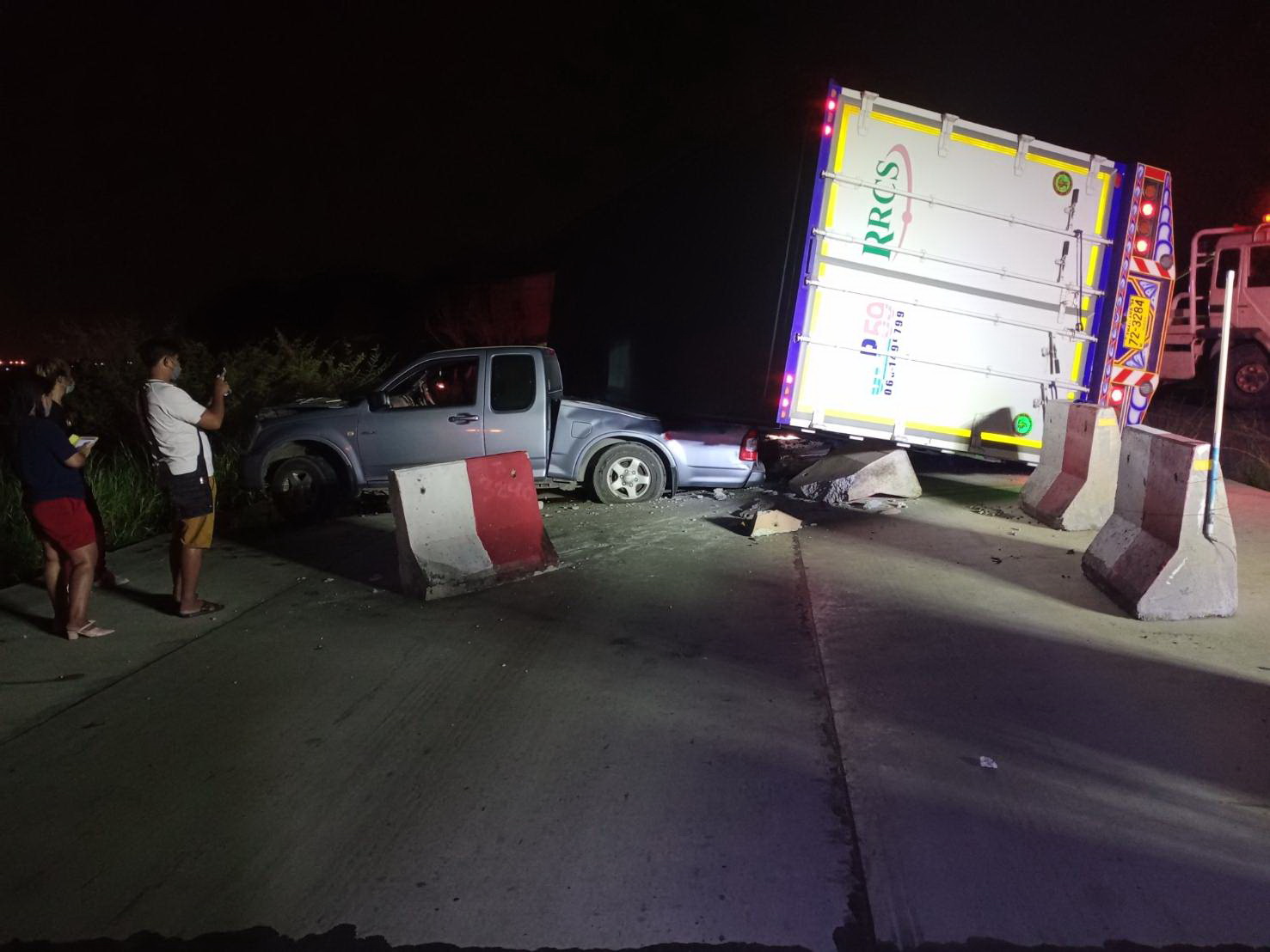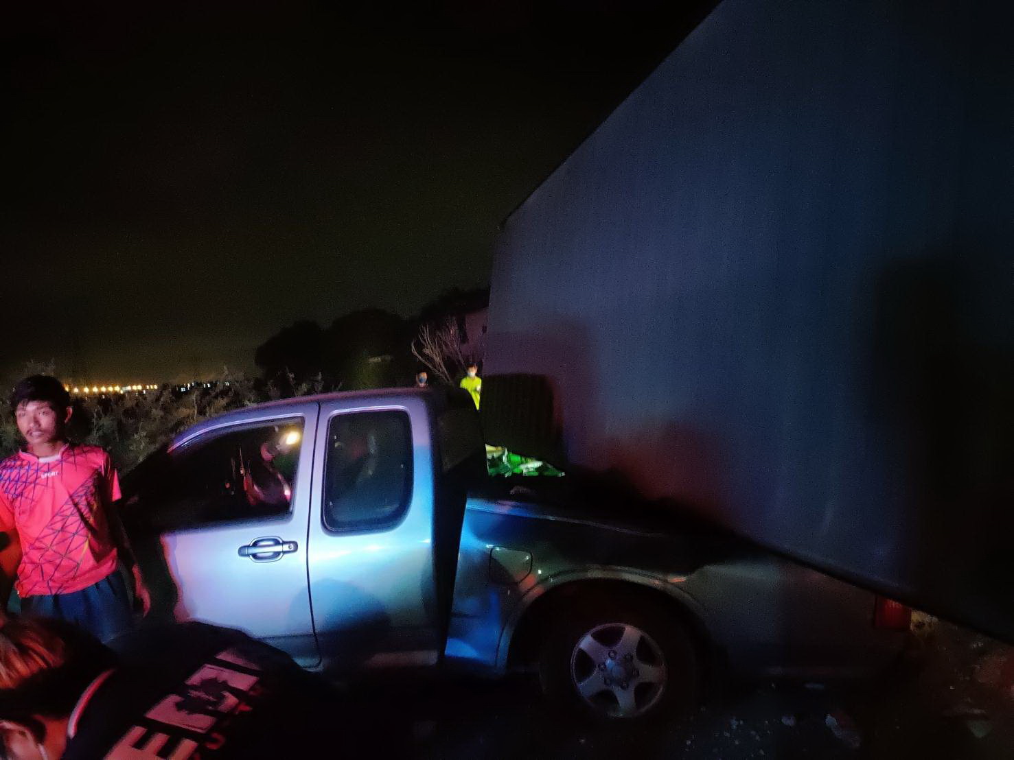 รถยนต์กระบะตัดหน้ารถยนต์บรรทุก 6 ล้อจนเสียหลักทับกระบะบาดเจ็บ 2 ราย
