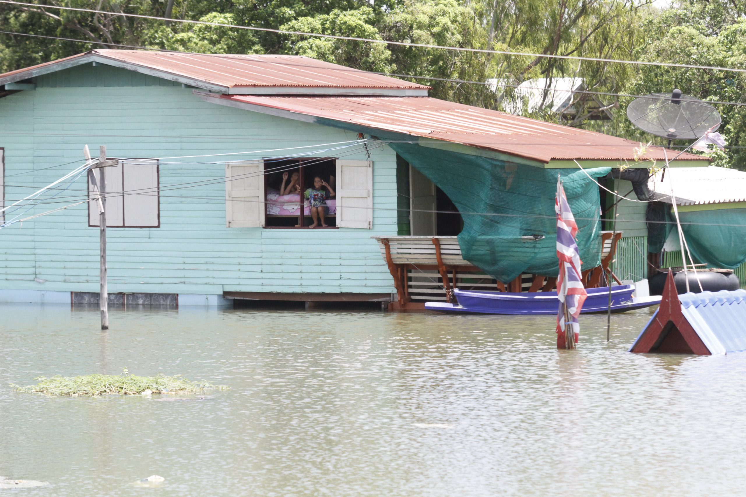 ถนนทางเข้าชุมชนหมู่บ้านยังคงถูกน้ำท่วมต้องใช้เรือพายในการเข้าออก ต้องนำรถยนต์ รถจักรยานยนต์นำมาจอดไว้ บนถนน