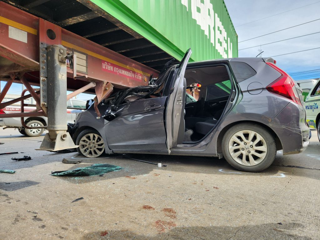 ระทึกกลางสี่แยกโรจนะ สาว 26 ปี ขับเก๋งพุ่งเสยพ่วง 22 ล้อ เข้ากลางลำรถมุดเข้าใต้ตู้คอนเทนเนอร์พังยับ