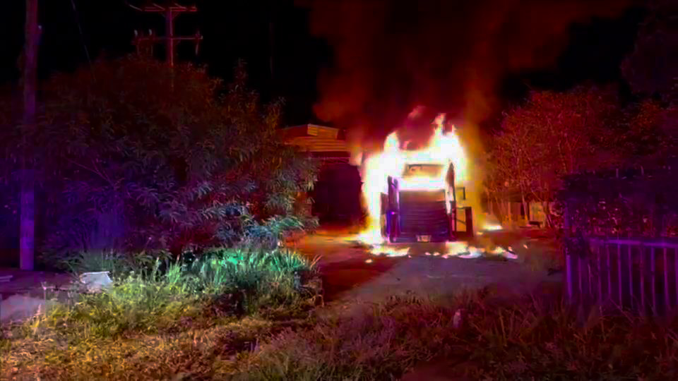 ไฟไหม้รถยนต์บัสรับส่งพนักงาน สภาพไม่ใช้งาน จอดไว้หน้าโกดังเก่าริมถนน