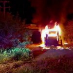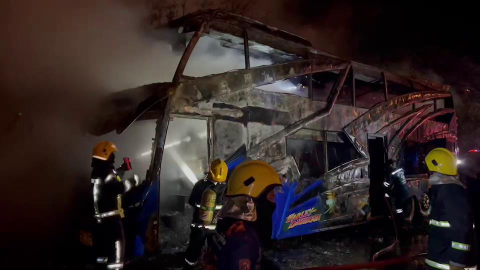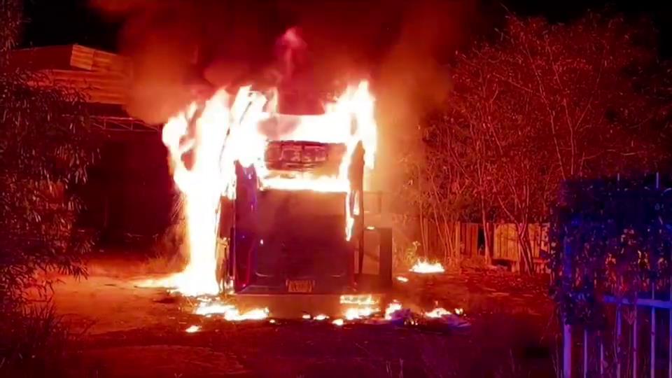 ไฟไหม้รถยนต์บัสรับส่งพนักงาน สภาพไม่ใช้งาน จอดไว้หน้าโกดังเก่าริมถนน