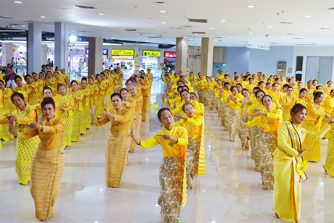 โดยมี นายธีระศักดิ์ โฉมสิริ รองผวจ.พระนครศรีอยุธยา ผศ.ดร.วราวุธ ตีระนันทน์ สมาชิกวุฒิสภา นาง จุรีพร ขันตี วัฒนธรรมจังหวัด พระนครศรีอยุธยา ดร.สมพล รัชตพิมลชัย ประธานเจ้าหน้าที่บริหารการตลาด ศูนย์การค้าอยุธยาซิตี้พาร์ค ดร.ณรามิล คุ้มรักษ์ ประธานบริษัท มหามงคลฟิล์ม สตูดิโอ โปรดักชั่น จำกัด นายกสมาคมสตรีไทยสากล พร้อมด้วย คณะนางรำนาฏศิลป์สมาคมสตรีไทยสากล กว่า 300 คน รำถวายพระพรชัยมงคล ในชุด “ฟ้อนดอกรวงผึ้ง และโคราชอวยพร”