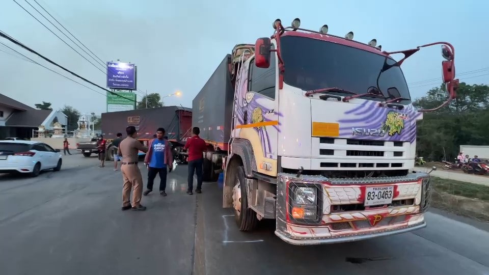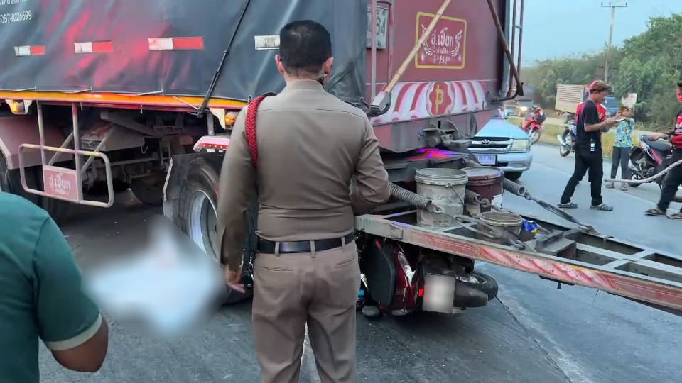 ชายวัย 23 ปี ขี่รถจยย.ชนรถบรรทุกพ่วงจนมุดเข้าใต้ท้องรถเสียชีวิต