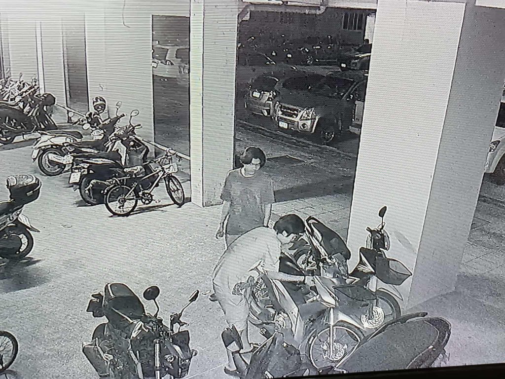 เล่าให้ฟังว่าหลังเลิกงานได้นำจักรานยนต์มาจอดเอาไว้ แล้วกลับขึ้นไปพักผ่อนจนช่วงเช้า ลงมาจากที่พักเพื่อที่จะไปทำงาน ตกใจมากรถจักรยานยนต์หายไป รีบไปขอตรวจสอบภาพจากกล้องวงจรปิดพบว่ามี คนร้ายเป็นชาย 3 คน ขับขี่รถจักรยานยนต์ ซ้อนท้ายกันมา เข้ามาจอดที่บริเวณลานจอด แล้วมีคนร้าย 2 คน เดินเข้ามาที่ใต้ถุนแฟลต ซึ่งมีรถจักรยานยนต์จอดอยู่จำนวนมาก เข้ามาเดินวนไปมาเลือกหารถจักรยานยนต์ เข็นรถจักรยานยนต์ของตนเองออกไป แล้ว รอด้านนอก คนร้าย ได้ไปขโมยรถจักรยานยนต์อีกคัน ซึ่งสามารถติดเครื่องได้ แล้วขับขี่ช่วยกันถีบรถจักรยานยนต์ของตนเองออกไป โดยคนร้ายอีกคนที่จอดรถจักรยานยนต์ รออยู่ขับตามกันออกไป