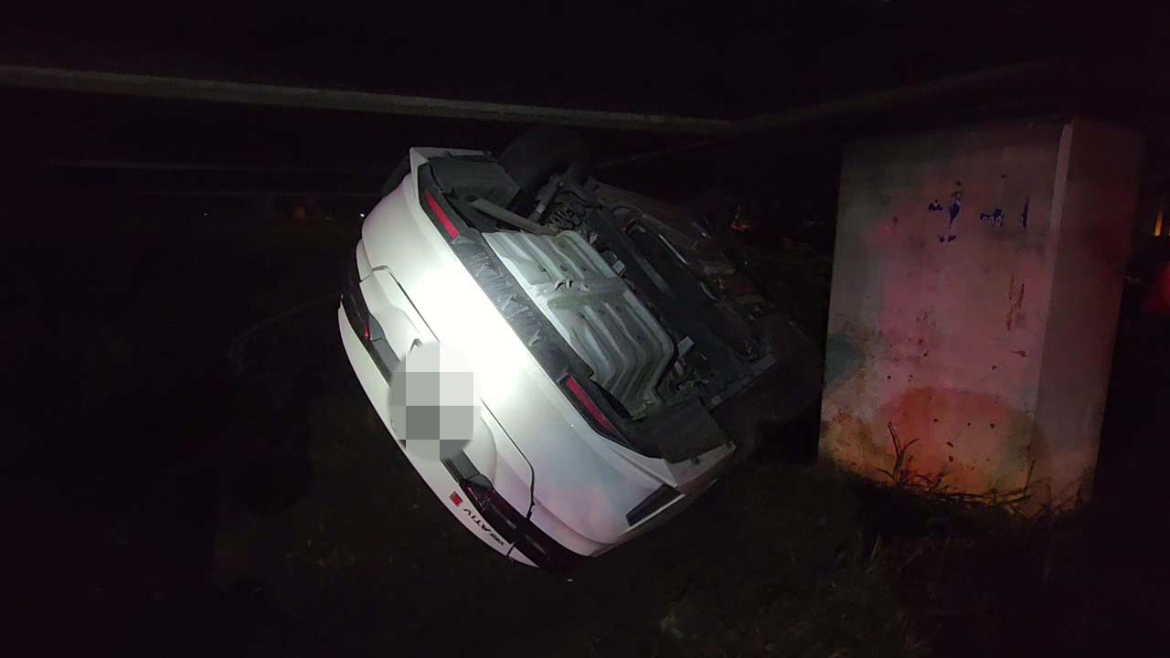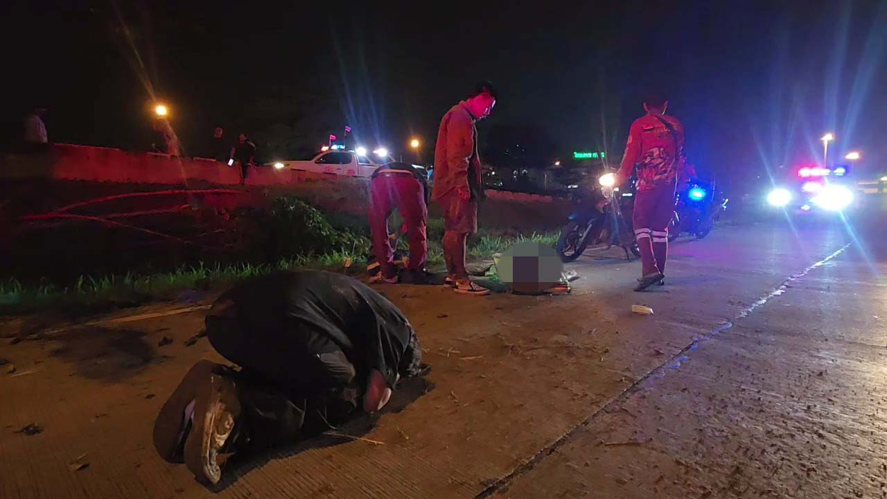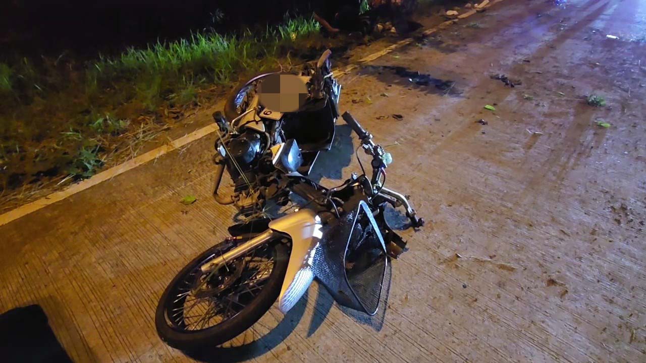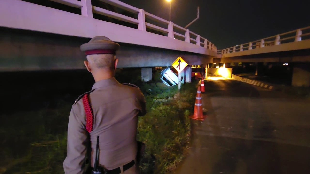 ในที่เกิดเหตุพบรถจักรยานยนต์ ฮอนด้าเวฟ ไม่ติดป้ายทะเบียน สภาพพังยับเยิน ห่างออกไปประมาณ 50 เมตร พบรถยนต์เก๋ง โตโยต้า สีขาว กรุงเทพมหานคร พลิกคว่ำชนตอม่อใต้สะพานกลับรถ สภาพเสียหายหนัก