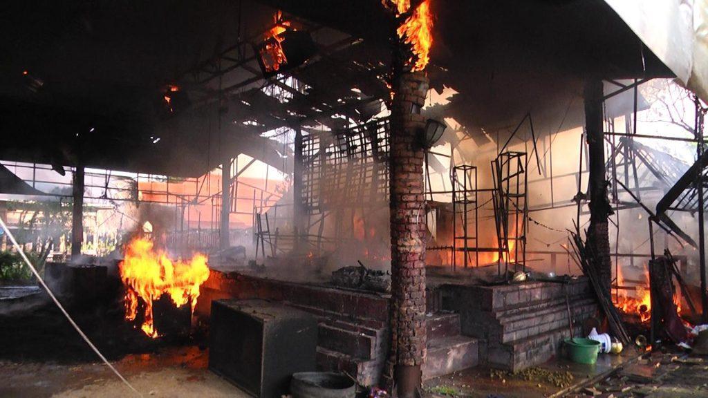 บริเวณกลางสระน้ำ ของตลาดน้ำ เป็นลานจัดการแสดงศิลปวัฒนธรรม เป็นอาคารหลังคามุงจากพบแสงเพลิงกำลังลุกไหม้ อย่างรวดเร็ว เจ้าหน้าที่ดับเพลิงช่วยกันฉีดน้ำสกัดนานกว่า 30 นาที เพลิงจึงสงบ ตรวจสอบสภาพพบ เวทีและอุปกรณ์การแสดงได้รับความเสียหายทั้งหมด ส่วนบริเวณของร้านค้านานาชนิดในตลาดน้ำไม่ได้รับความเสียหาย