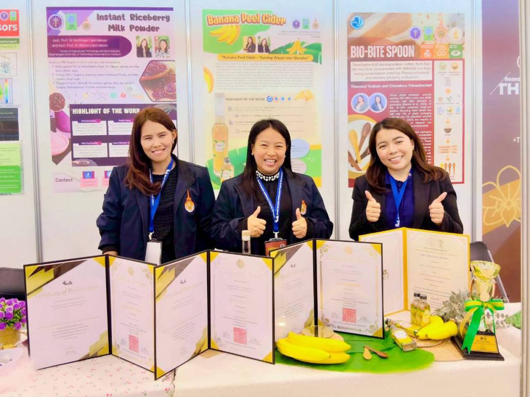 1. นมข้าวไรซ์เบอร์รี่ผง – รางวัลเหรียญทอง และ NRCT Honorable Mention Award ผลงานโดย ผู้ช่วยศาสตราจารย์ ดร.วชิรญา เหลียวตระกูล คณะเทคโนโลยีการเกษตรและอุตสาหกรรมเกษตร นวัตกรรมที่นำเทคนิค Foam-Mat Drying มาประยุกต์ใช้กับการผลิตนมข้าวไรซ์เบอร์รี่ผงเป็นครั้งแรก ช่วยให้ผลิตภัณฑ์ละลายน้ำได้ดี เก็บรักษาได้นาน และเพิ่มมูลค่าวัตถุดิบข้าวไทยอย่างมีประสิทธิภาพ
