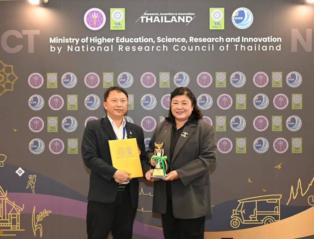 3. อุปกรณ์วัดความชื้นไร้สายแบบไม่ทำลายวัสดุ – รางวัลเหรียญเงิน และ NRCT Special Award ผลงานโดย ผู้ช่วยศาสตราจารย์ ดร.สมพร ศรีวัฒนพล คณะวิศวกรรมศาสตร์และสถาปัตยกรรมศาสตร์อุปกรณ์เรดาร์ไร้สายที่สามารถตรวจจับความชื้นรอบรากไม้ได้แบบไม่ต้องสัมผัสหรือทำลายวัสดุ เชื่อมโยงการวัดค่ากับสัญญาณแม่เหล็กไฟฟ้า พร้อมระบบ Self-Learning ที่เพิ่มความแม่นยำ เหมาะสำหรับระบบเกษตรอัจฉริยะและการบริหารจัดการน้ำในอนาคต