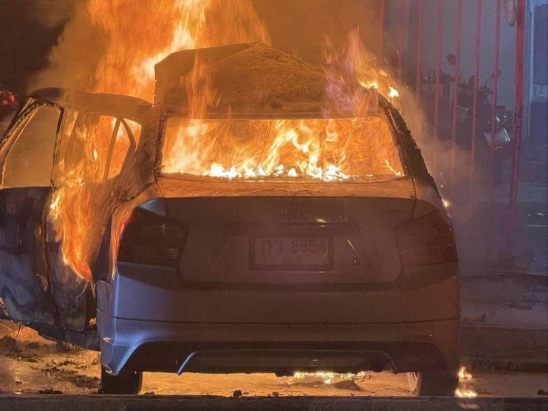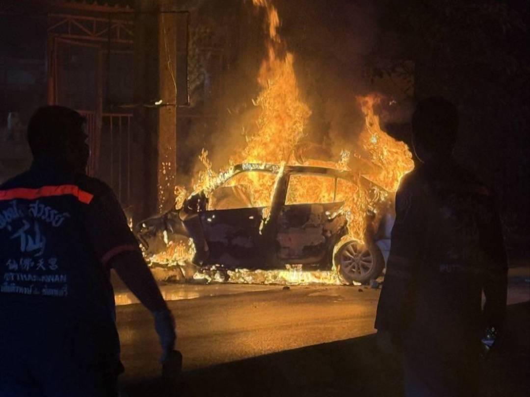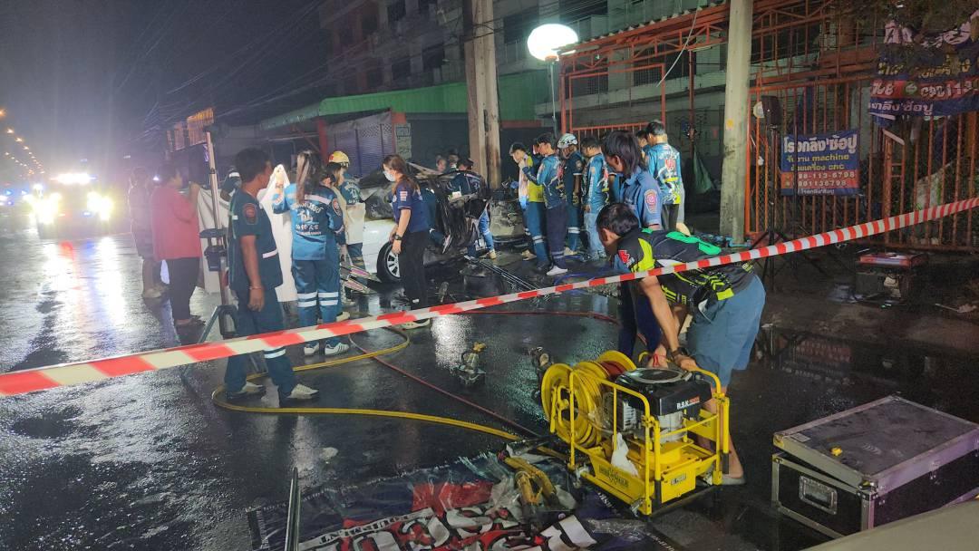 จากการตรวจสอบกล้องวงจรปิดบริเวณอาคารพบภาพรถยนต์เก๋งขับมาด้วยความเร็ว ก่อนพุ่งชนเสาไฟฟ้าริมถนนอย่างแรง จนเครื่องยนต์กระเด็นเข้าไปในอาคารและเกิดประกายไฟ เจ้าของอาคารรีบออกมาดับไฟและพยายามช่วยเหลือผู้ขับขี่ทันที แต่ไม่สำเร็จ เนื่องจากไฟลุกไหม้อย่างรวดเร็ว