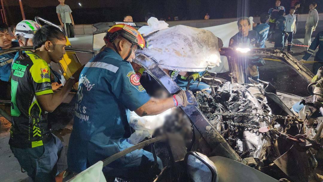 เกิดเหตุพบรถยนต์เก๋งฮอนด้า ซิตี้ สีบรอนซ์เงิน ทะเบียนลพบุรี สภาพชนอัดติดกับเสาไฟฟ้าริมถนน พังยับเยิน เพลิงกำลุงไหม้อย่างรุนแรง ภายในรถพบคนขับรถยนต์เก๋งติดอยู่ในรถ เจ้าหน้าที่ไม่สามารถเข้าไปช่วยเหลือได้ ต้องเร่งระดมฉีดน้ำเพื่อควบคุมเพลิง หลังเพลิงสงบพบเพลิงลุกไหม้เสียหายเกือบทั้งคัน เจ้าหน้าที่ ต้องใช้อุปกรณ์ตัดถ่างนำร่างผู้เสียชีวิตที่ออกมาจากรถ พบว่าท่อนบนถูกเพลิงไหม้