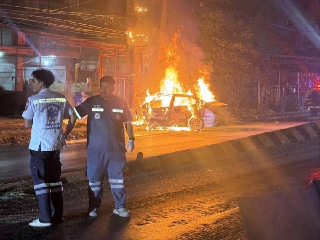 จากการตรวจสอบกล้องวงจรปิดบริเวณอาคารพบภาพรถยนต์เก๋งขับมาด้วยความเร็ว ก่อนพุ่งชนเสาไฟฟ้าริมถนนอย่างแรง จนเครื่องยนต์กระเด็นเข้าไปในอาคารและเกิดประกายไฟ เจ้าของอาคารรีบออกมาดับไฟและพยายามช่วยเหลือผู้ขับขี่ทันที แต่ไม่สำเร็จ เนื่องจากไฟลุกไหม้อย่างรวดเร็ว