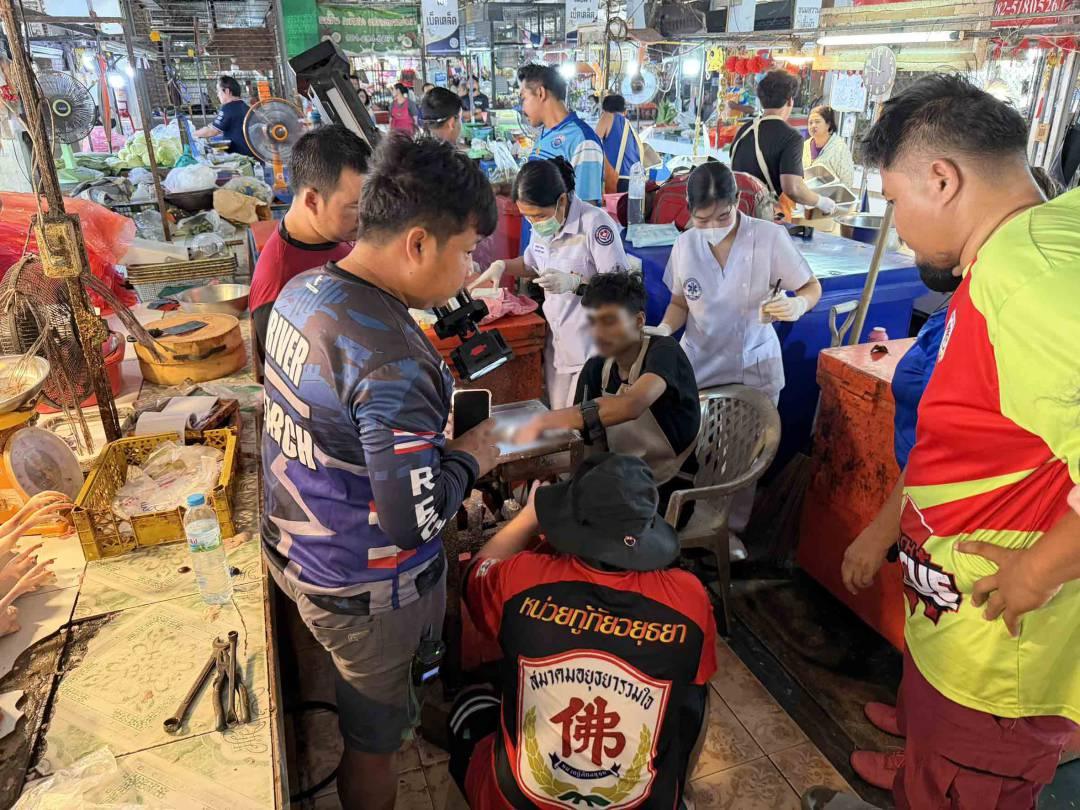 ที่เกิดเหตุบริเวณแผงจำหน่ายเนื้อไก่สด พบผู้บาดเจ็บทราบชื่อ นายฮัมซะ อายุ 19 ปี ชาวเมียนมา ลูกจ้างร้านไก่สด ถูกเครื่องบดเนื้อหนีบมือซ้ายติดคาอยู่ในช่องใส่เนื้อไก่ เจ้าหน้าที่ต้องใช้เครื่องตัดถ่าง ตัดชิ้นส่วนบางส่วนของเครื่อง ออกอย่างระมัดระวัง พร้อมให้กู้ชีพฉีดยาชา ลดความเจ็บปวด และให้น้ำเกลือ ใช้เวลากว่า 1 ชั่วโมง จึงสามารถนำมือออกมาได้