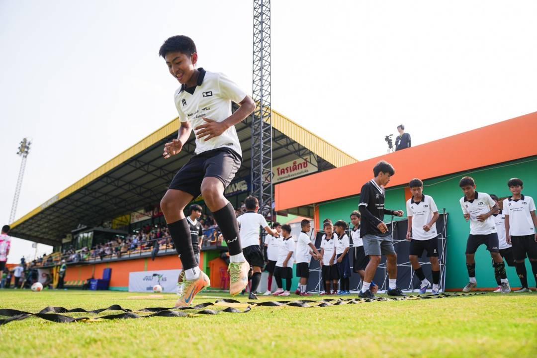 โดยในการฝึกซ้อมภาคปฏิบัติ น้องๆ เยาวชนจะได้เรียนรู้ทักษะผ่าน 5 ฐานการฝึกซ้อมสุดเข้มข้น ได้แก่ การเลี้ยงบอล : ฝึกควบคุมบอล เลี้ยงซิกแซก และการใช้ความเร็ว, การส่งและรับบอล : พัฒนาความแม่นยำและจังหวะสัมผัสบอลแรก , การยิงประตู : เพิ่มพลัง ความแม่นยำ และความมั่นใจในการจบสกอร์, ความคล่องตัว : สเต็ปเท้า บันไดลิง สร้างความสมดุลให้ร่างกาย, การควบคุมบอล : สร้างความคุ้นเคยกับลูกฟุตบอลในพื้นที่แคบ เพื่อเป็นก้าวสำคัญในการจุดประกายความฝัน “จากสนามหน้าบ้าน สู่มาตรฐานระดับสากล” ให้กับเยาวชนไทยอย่างแท้จริง