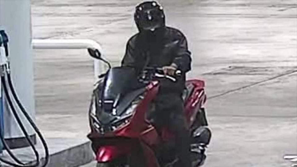 จากภาพในกล้องวงจรปิด พบชายสวมหมวกกันน็อกเต็มใบสีดำ สวมเสื้อแจ็คเก็ตและกางเกงยีนส์สีดำ ขี่รถจักรยานยนต์ฮอนด้า พีซีเอ็กซ์ สีแดง เข้ามาทำทีเป็นลูกค้า ก่อนเติมน้ำมันเบนซินจำนวน 100 บาท จากนั้นอ้างขอสแกนจ่ายเงิน พร้อมแจ้งหมายเลขโทรศัพท์เพื่อสะสมแต้ม