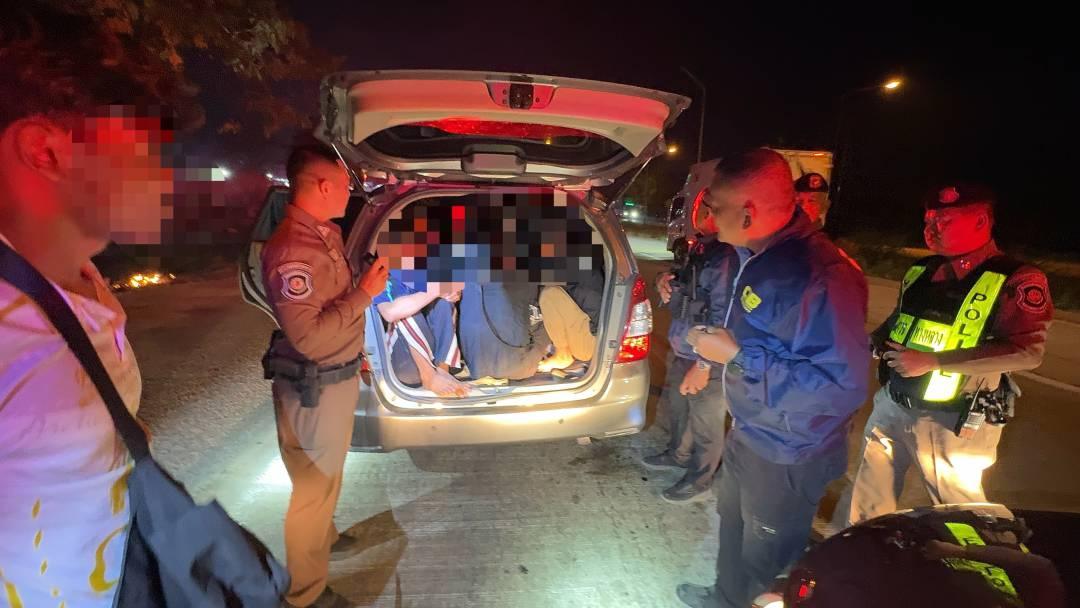 ขณะเจ้าหน้าที่เฝ้าระวัง พบรถยนต์ต้องสงสัย เป็นรถกระบะ 4 ประตู ยี่ห้อโตโยต้า สีเทา ทะเบียนกรุงเทพมหานคร มีลักษณะบรรทุกหนักผิดปกติ และติดฟิล์มมืดทึบ จึงส่งสัญญาณเรียกตรวจสอบ จากการตรวจค้น พบผู้ขับขี่ทราบชื่อภายหลังคือ นายละพี่ฮุย อายุ 23 ปี สัญชาติเมียนมา และพบแรงงานต่างด้าวอัดแน่นอยู่ภายในรถรวม 14 คน ไม่สามารถแสดงหนังสือเดินทางหรือเอกสารแทนได้