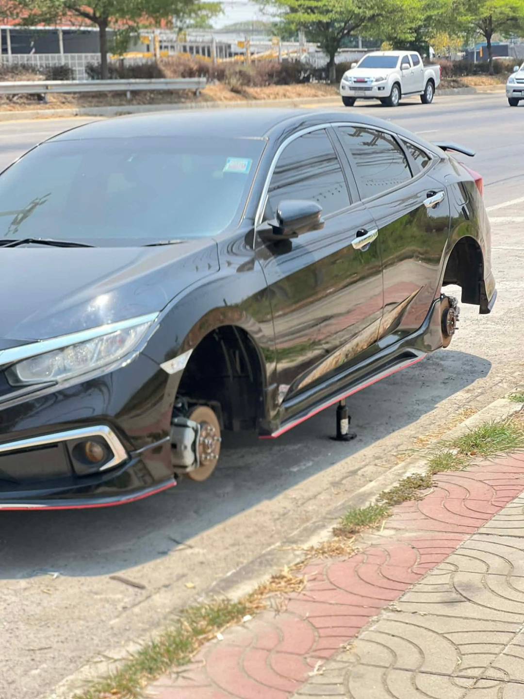 จากภาพกล้องวงจรปิดพบว่า คนร้ายเป็นชาย สวมหมวก ขับรถยนต์กระบะแคป ยี่ห้อมิตซูบิชิ สีดำ มาจอดต่อท้ายรถยนต์เก๋ง Honda Civic สีดำ ที่จอดอยู่ริมถนน ก่อนลงมือก่อเหตุอย่างใจเย็น โดยใช้แม่แรงยกรถบริเวณกึ่งกลางตัวรถ แล้วใช้อุปกรณ์ขันน็อตถอดล้อ เริ่มจากล้อหน้าและล้อหลัง ก่อนนำล้อทั้ง 2 ล้อขึ้นท้ายกระบะ และขับหลบหนีไปทางถนนสายเอเชีย