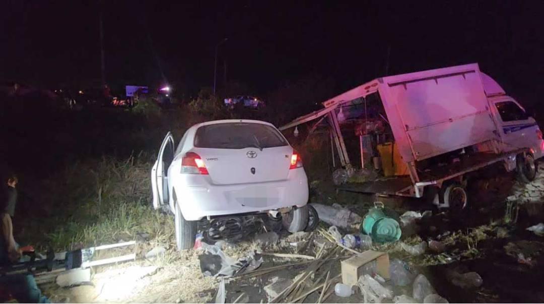 เก๋งพุ่งชน จยย.ลากไกลกว่า 40 เมตร ก่อนอัดร้านโรตีสายไหม ดับ 1 เจ็บ 6