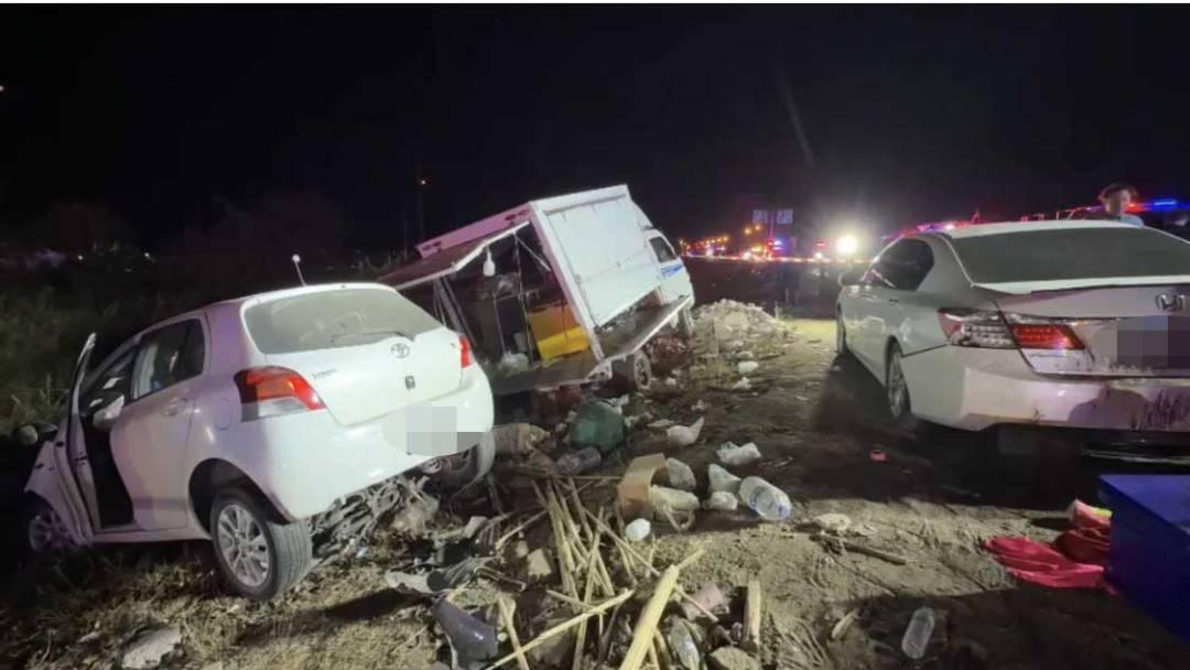 จากการตรวจสอบพบรถยนต์เก๋ง Toyota Yaris สีขาว ทะเบียน กง 610 นครนายก สภาพด้านหน้าพังเสียหาย ใต้ท้องรถพบรถจักรยานยนต์ Honda Wave 125i สีน้ำเงิน ทะเบียน 1กว 3401 พระนครศรีอยุธยา สภาพพังยับเยิน นอกจากนี้ใกล้กันยังพบรถฟู้ดทรัคขายโรตีสายไหม ยี่ห้อซูซุกิ สีขาว ทะเบียน ผก 2856 พระนครศรีอยุธยา ถูกชนท้ายพลิกตะแคงตกข้างทาง และรถยนต์เก๋ง Honda Accord สีขาว ทะเบียน ขฉ 5784 พระนครศรีอยุธยา ถูกชนท้ายได้รับความเสียหาย