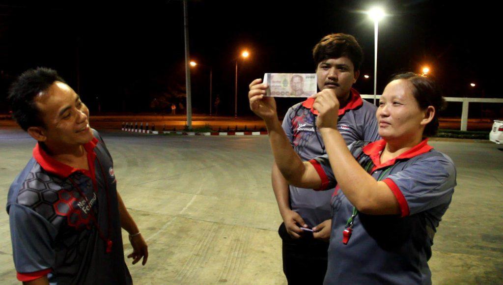 พบเด็กปั๊มน้ำมันจับกุมพุดคุยกันอยู่พร้อมนำแบงค์ปลอมขึ้นมาส่องเปรียบเทียบ ด้วยสีหน้าตกใจ จากการตรวจสอบแบงค์ปลอมพบว่ามีความเหมือนกับของจริงถ้าไม่สัมผัสหรือมองใกล้ๆ