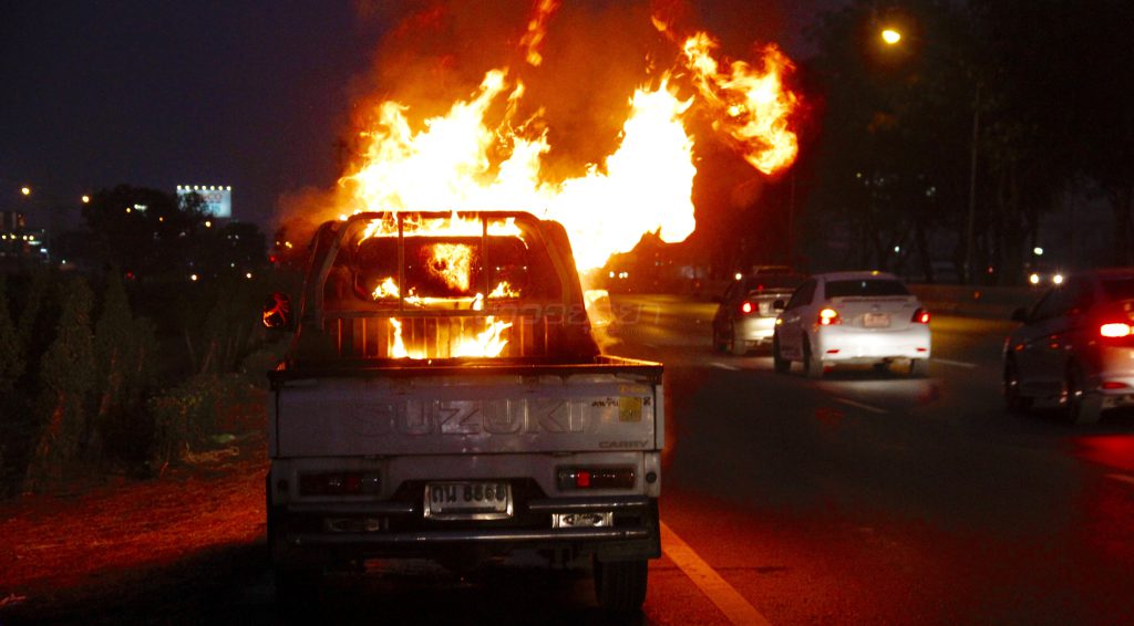 พบรถยนต์กระบะ ซูซุกิ หมายเลขทะเบียน ถน -8868 กรุงเทพมหานครจอดอยู่ริมถนน เพลิงกำลุกไหม้จากภายในที่นั่งคนขับ พลเมืองดีพยายามช่วยกันนำถังเคมีฉีดเพื่อควบคุมเพลิง แต่เพลิงลุกไหม้โหมขึ้นอย่างรุนแรง ไม่สามารถดับไฟได้