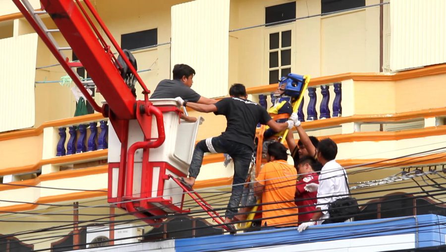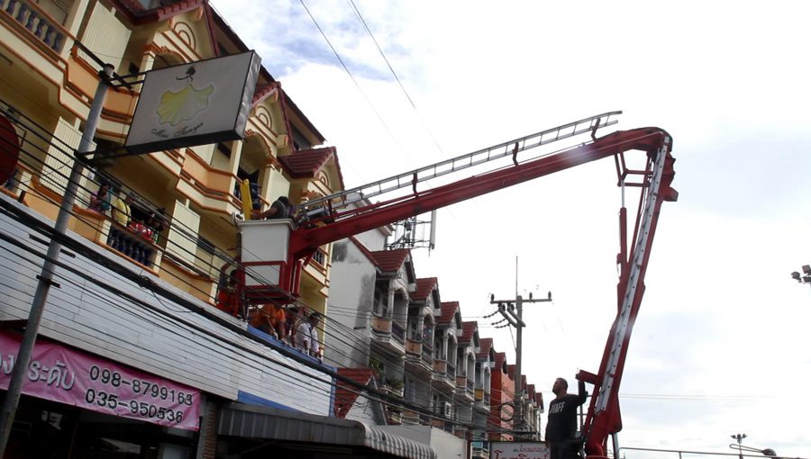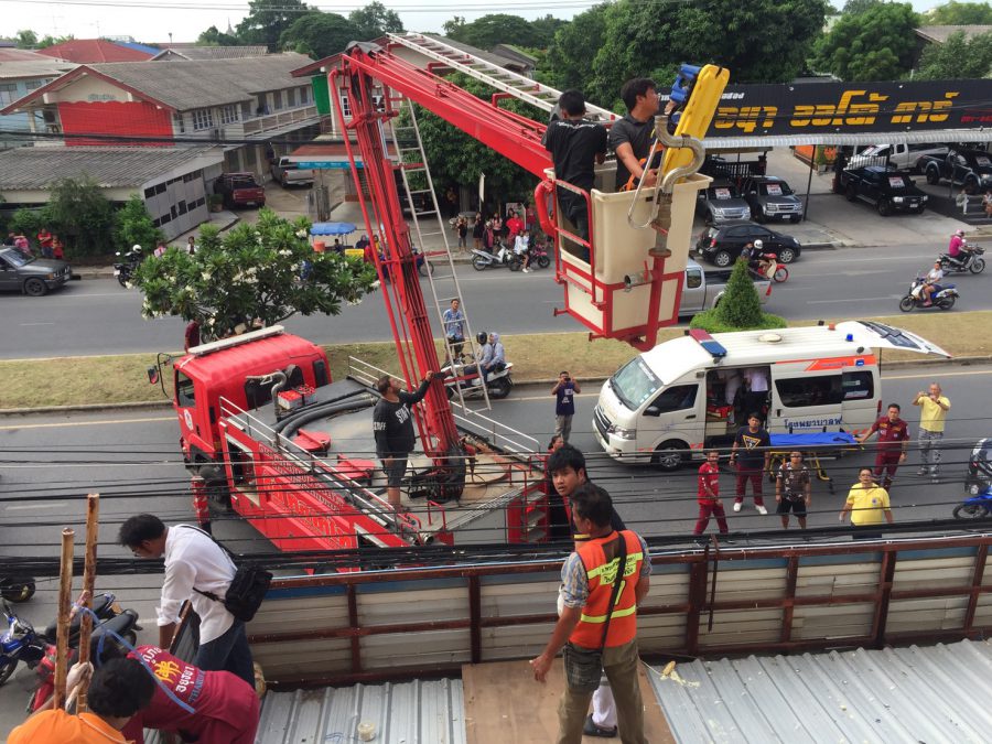 พบ พบว่าเป็นอาคาร ขนาดความสูง 3 ชั้น ที่บริเวณระเบียงชั้นที่ 1 พบร่างของนายวันชัย ทวี อายุ 39 ปี ชาว จ.อุดรธานี นอนร้องครวญครางด้วยความเจ็บปวด เจ้าหน้าที่ต้องใช้รถกระเช้า นำเจ้าหน้าที่ขึ้นไปให้การช่วยเหลือเป็นไปด้วยความยากลำบากและต้องระมัดระวังเนื่องจากที่ทั้งสายไฟฟ้าแรงสูงและสายสื่อสาร จากนั้นเร่งให้การช่วยเหลือปฐมพยาบาลเบื้องต้น นำผู้บาดเจ็บใส่เปล เคลื่อนย้ายลงมา นำส่งโรงพยาบาลพระนครศรีอยุธยา
